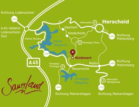 Anfahrt ab A 45: Abfahrt Lüdenscheid-Süd, Richtung Herscheid-Plettenberg, nach ca. 200m rechts abbiegen Richtung Fürwiggetalsperre. Dann am Gasthaus Neuemühle scharf links nach Stottmert abbiegen, Sie finden uns nach ca. 900m